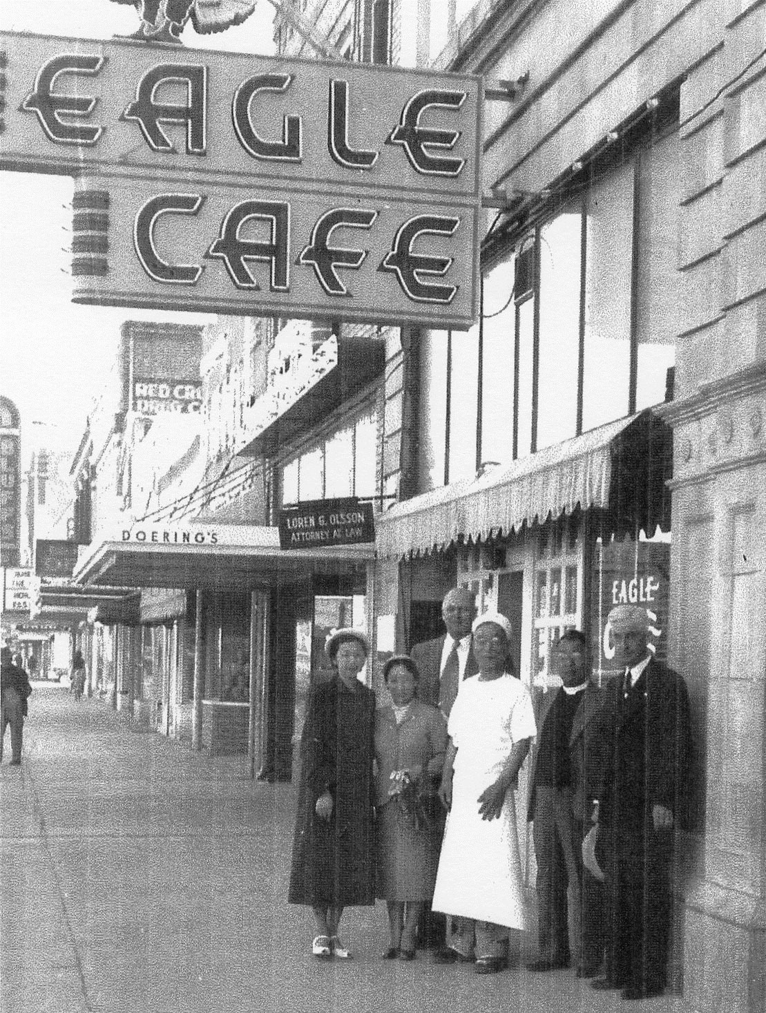 Set squarely in the western Nebraska Panhandle, Scottsbluff was home to a small Japanese American community of about 250, established by Issei like Okada’s father who built the railroads. The sugar beet industry kept them there. The town held a Japanese social hall and several Japanese-owned cafes and boardinghouses on Broadway, the main street through town. The three students from Minidoka got jobs at the Eagle Cafe, working for an Issei owner and cook, Shigemori Hangui (“unusual name for a Japanese,” recalled Ashida). They called him Sam, and cleared tables and washed dishes for him; Okada took over scrubbing the heavy pots when Ashida could not.