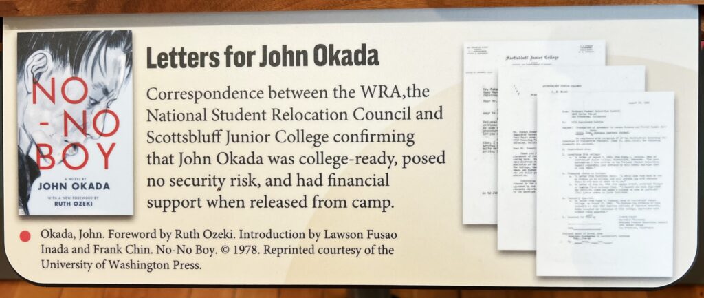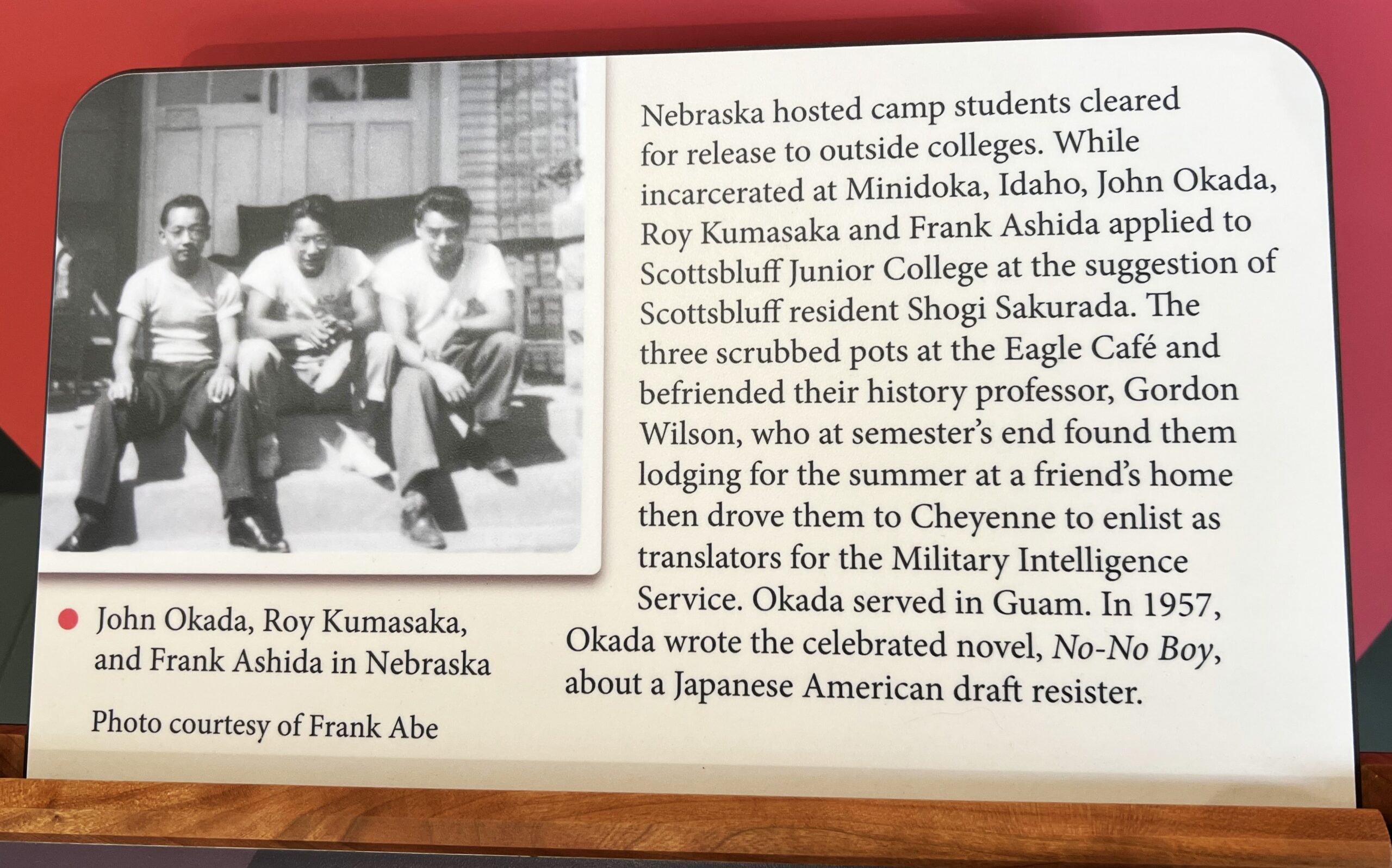The June 8 grand opening is the culmination of years of work by Vickie Sakurada Schaepler. Vickie is the niece of Shogi Sakurada, who steered Okada and his college buddies toward Scottsbluff when they were searching for a college outside the exclusion zone that would accept them. Vickie provided me with the local history that informed the Nebraska section below of my 2018 biography of John Okada. With that material, I was able in turn to draft the text for this panel in the new Japanese Hall exhibit.