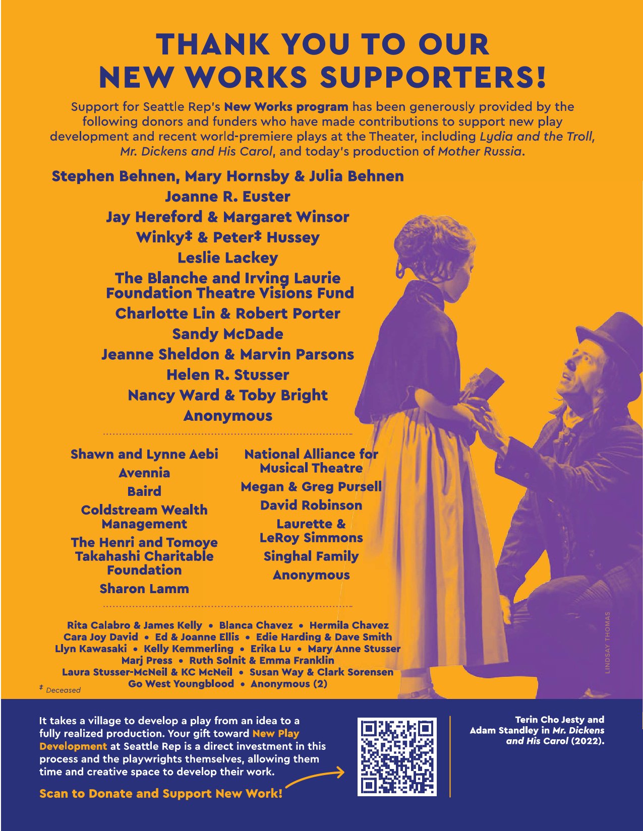 Crucial support for the foundation logodirector and actors to lend their talents for this four-day workshop comes from the Henri and Tomoye Takahashi Foundation. We are also grateful to supporters of the New Works Program at Seattle Rep. list of donorstheater seats