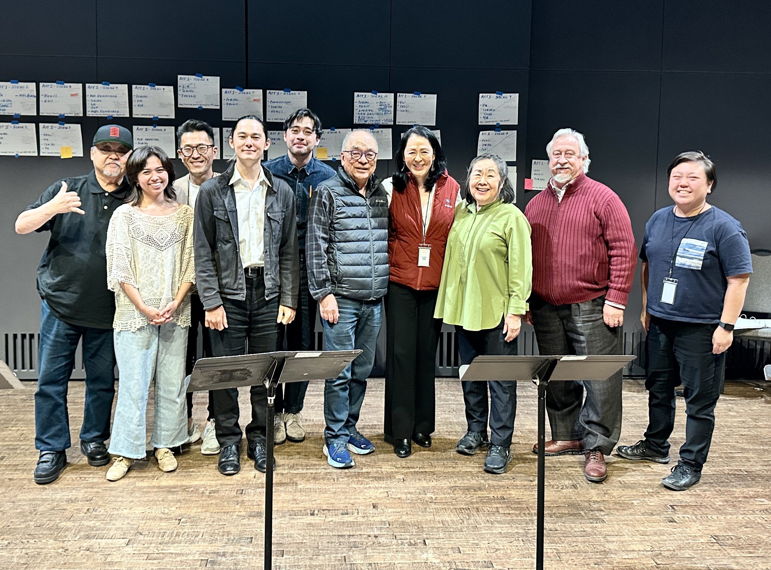 Cast and crew of NO-NO BOY staged reading, May 8, 2024. (from left) Keone Young, Alegra Batara, Michael Wu, Ken Yoshikawa, Josh Kenji Langager, Frank Abe, Leslie Ishii, Emily Kuroda, Wesley Mann, and Risa Kurosaki.